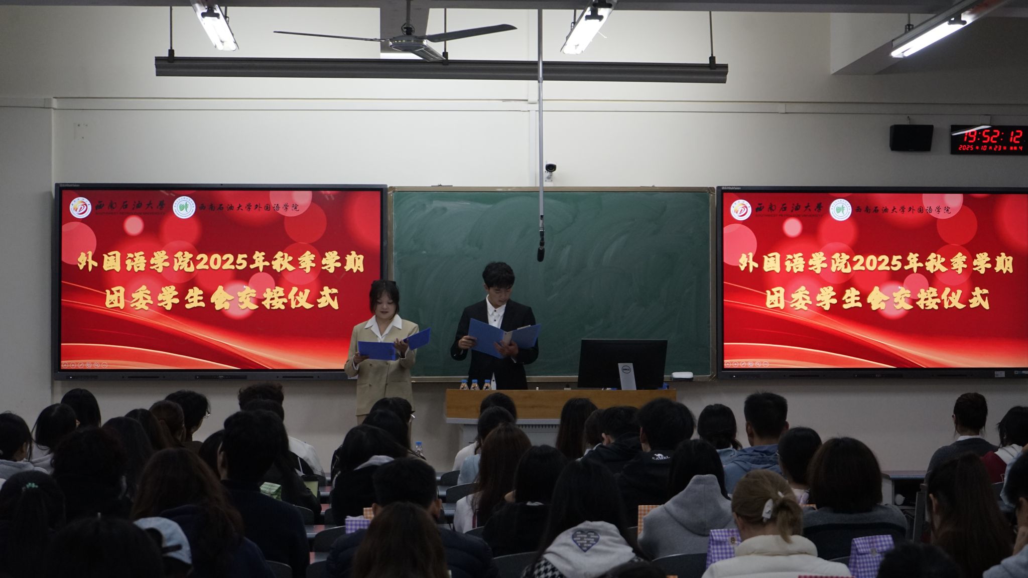 10月23日晚,我院2025年秋季学期团委学生会交接仪式在博学楼B502隆重举行。学院团委书记、学工办主任罗文双,第39届、第40届团委学生会主席团与各部门部长,2025级团委学生会新生委员齐聚一堂,共同见证责任与使命的传递。
