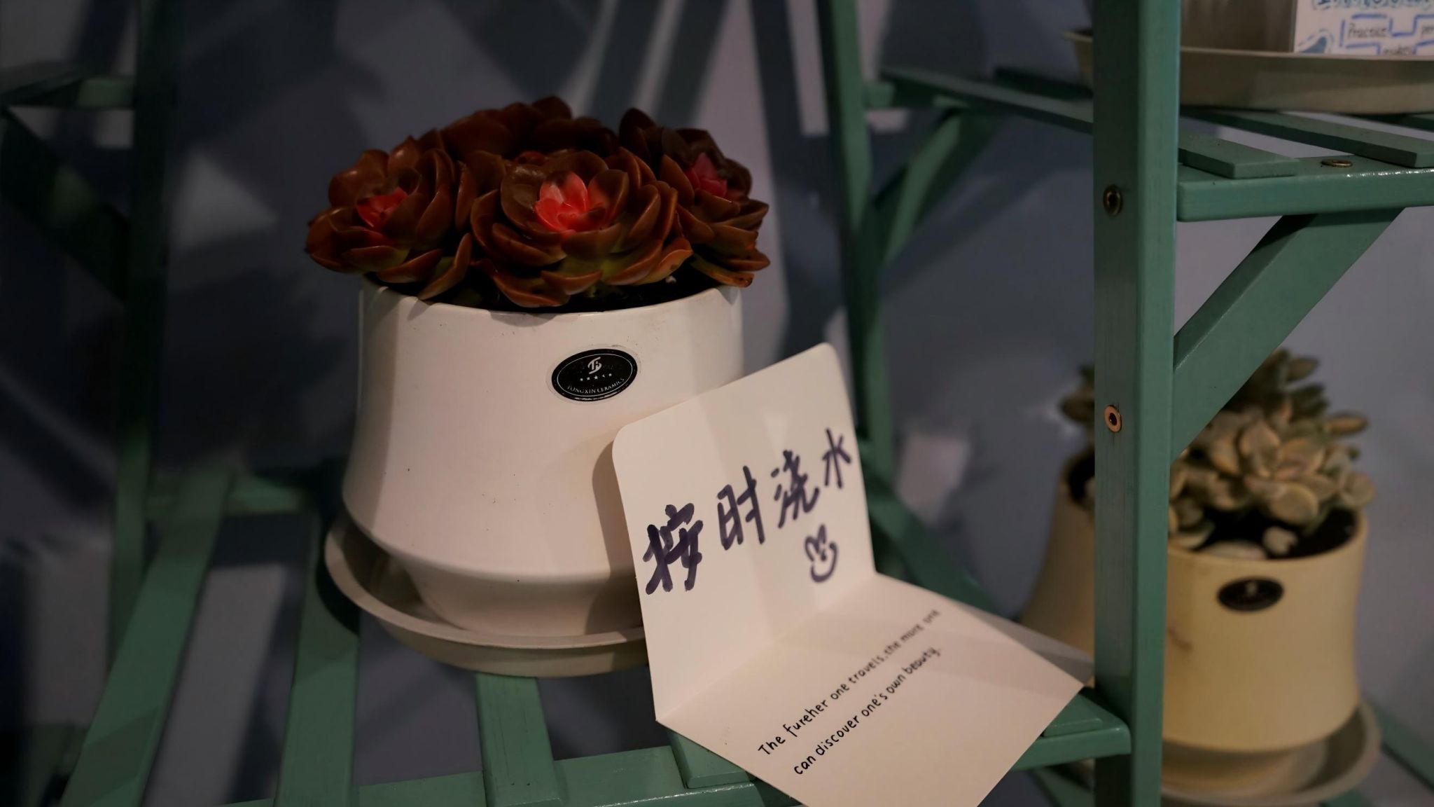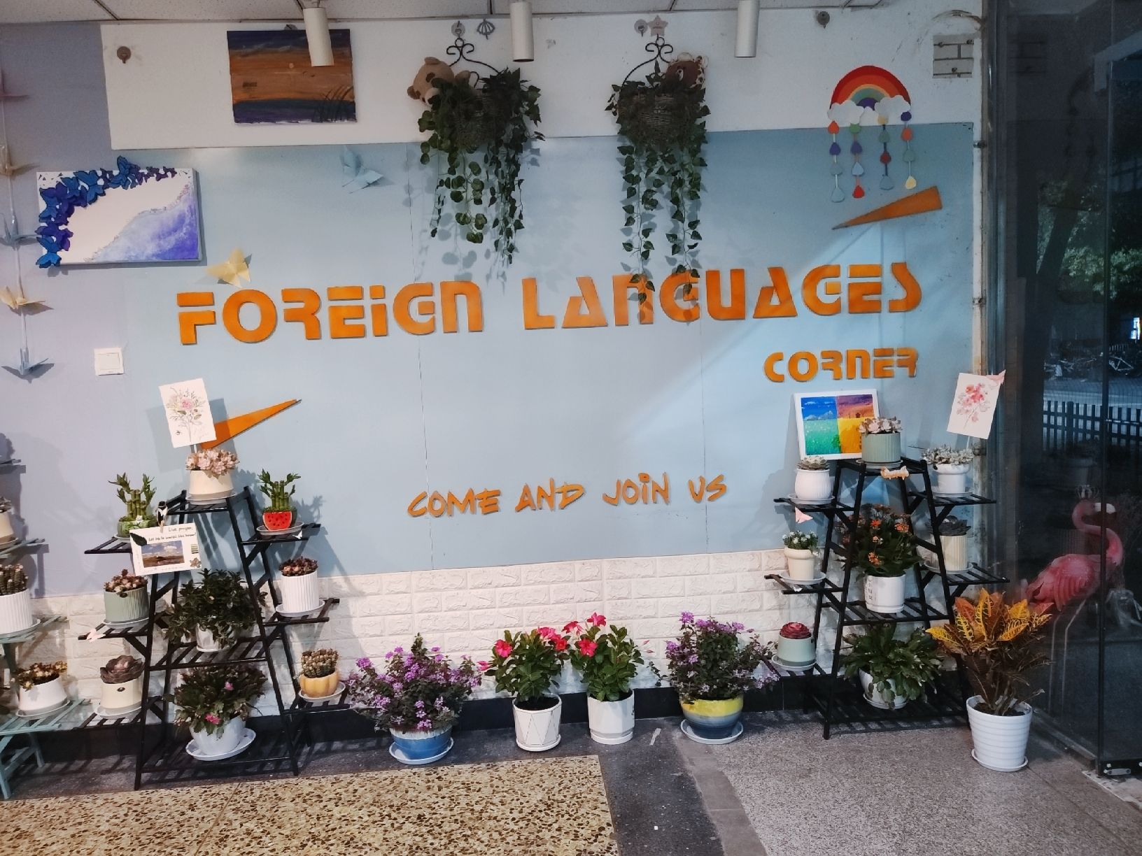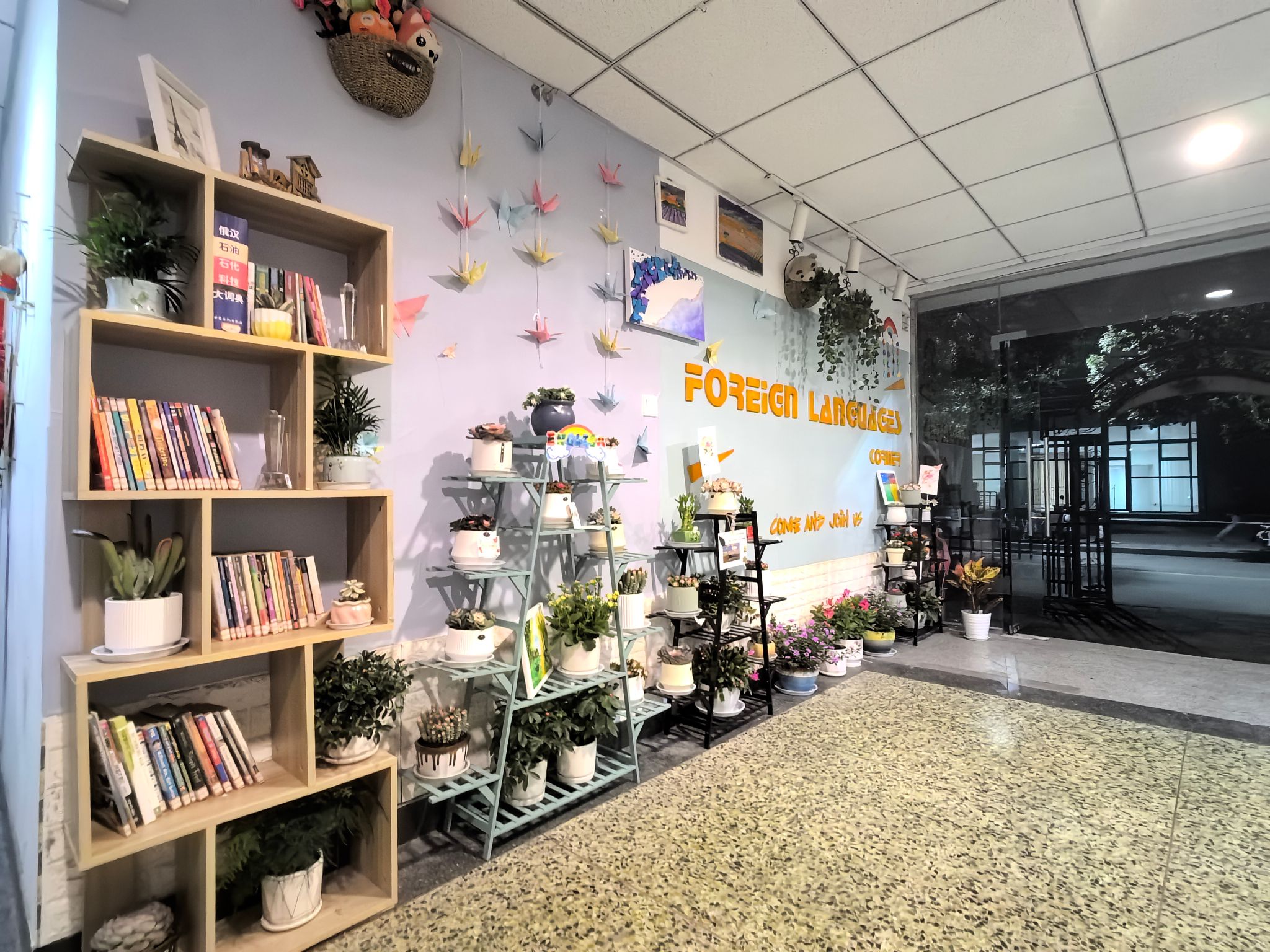 在建设过程中,学生全程参与设计、建设、维护。为丰富空间形态、增强文化氛围,学院面向全院征集创意手工作品,并后续评选出一、二、三等奖予以表彰。同学们踊跃参与,折叠出五彩的千纸鹤和蝴蝶,绘制了精美的风景油画,还有的用英语写下温馨话语,点缀其间。这些作品与绿植相映成趣,以植物为载体,以语言为纽带,共同将外语角打造成了融合自然之美与多元文化的沉浸式空间。
