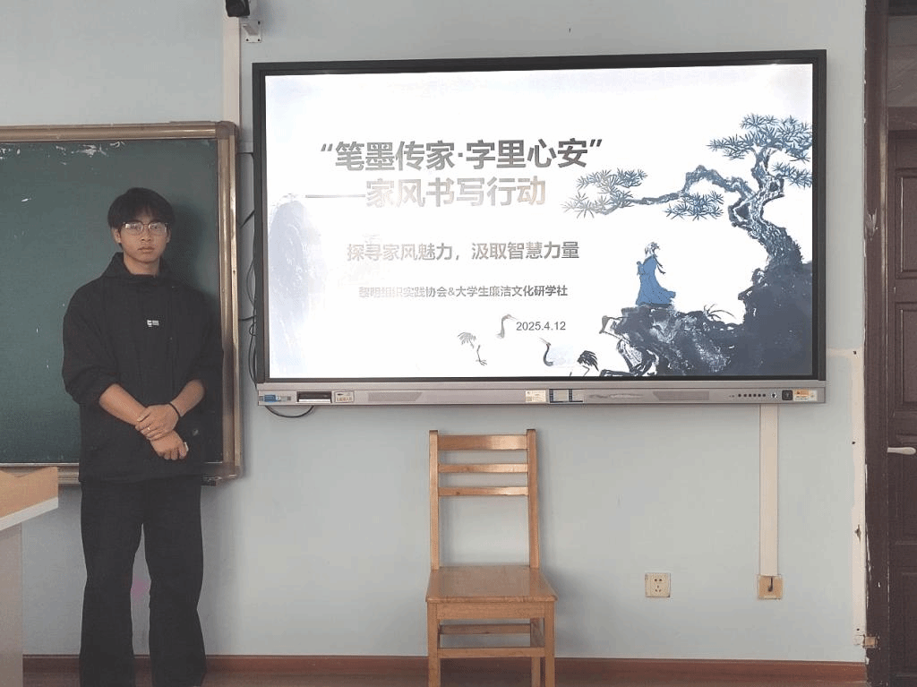 为通过沉浸式书写体验,引导学生深刻领悟传统家训中的智慧,促进家风文化的传承与发展,4月12日,黎明组织实践协会与大学生廉洁文化研学社在思学楼C201教室联合举办“笔墨传家·字里心安”家风书写活动。黎明组织实践协会理事钱泓勋主持活动,社团指导老师、我院辅导员曾志刚出席,社团会员积极参与。