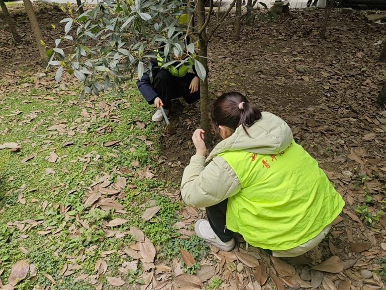 除草松土组手持工具清理林间杂草、疏松土壤;修剪养护组为树木修枝定型,确保健康生长;垃圾分类组则穿梭于林间步道,细致分拣落叶与杂物,实现资源循环利用。在修剪枝叶的过程中,同学们小心翼翼地操作着工具,生怕损伤了每一片绿叶。除草松土的同学们则用力挥舞着锄头,为树木创造更加良好的生长环境。浇水施肥的小组更是细心周到,他们根据树木的需求,适量地给予水分和养分。大家齐心协力,互帮互助,现场呈现出一片热火朝天的劳动景象。