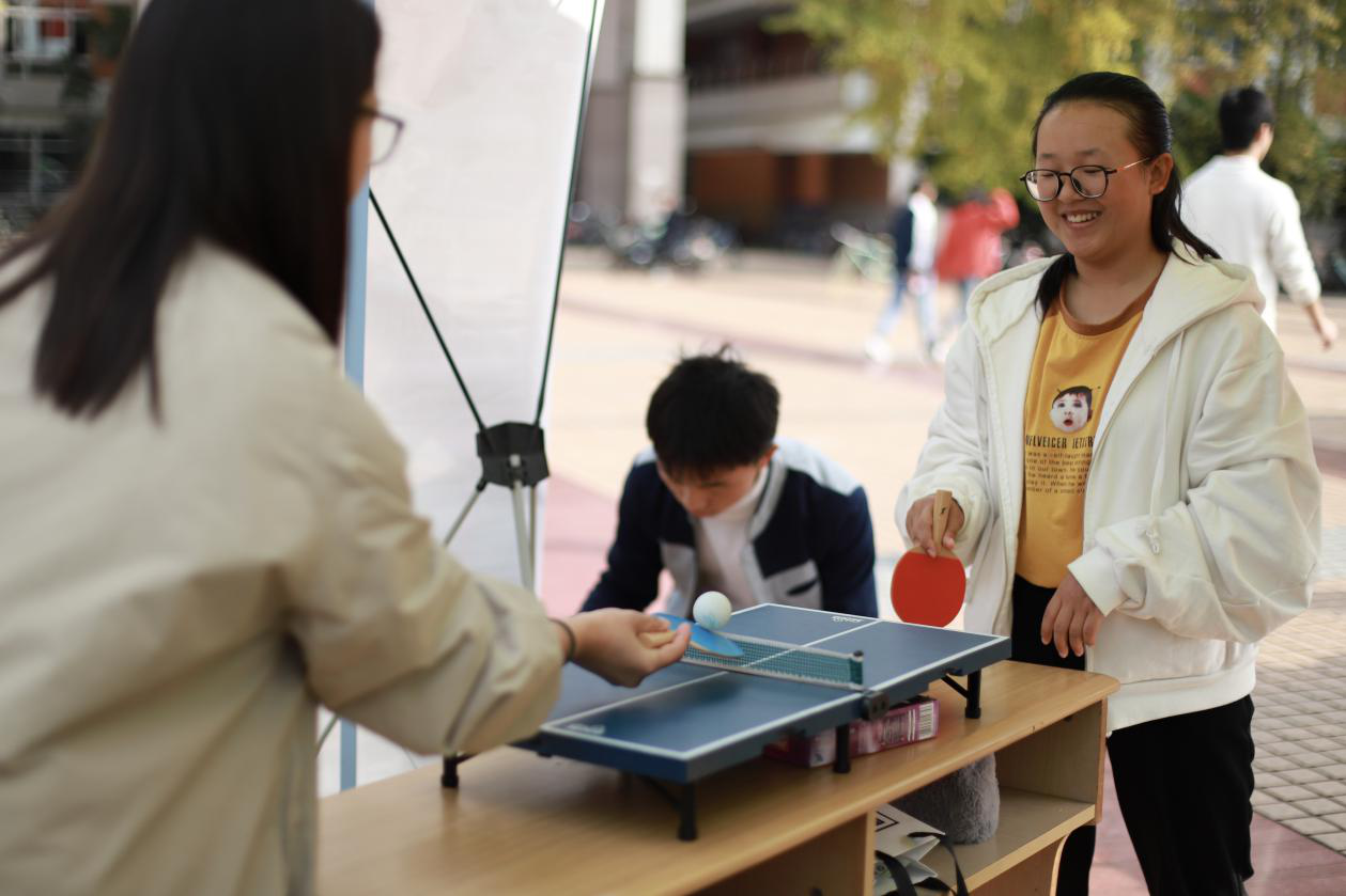 台下,各个展示社团通过有趣的小游戏与观展的同学进行互动。义旅阳光协会将心中的美好祝福以红丝带为载体,装点了博学广场旁的银杏林,成为了冬日里一道温暖亮丽的风景;现视研动漫社的cosplay展给观众带来了别样的视觉体验;乒乓球协会用迷你球桌将运动以游戏的方式呈现出来,显得别致有趣。羽毛球协会的击球入篮就可获得奖品,南粤文化交流社的击靶猜歌名,舞狮游广场等等。丰富多彩的活动,展现出了社团各自独特的风采。