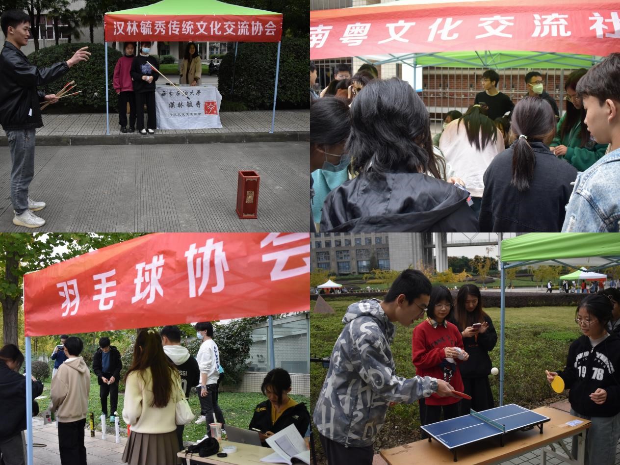 中华魅力,源远流长,汉林毓秀传统文化交流协会以投壶等形式向大家传播了中华文化的生动性,让大家感受到古人的智慧以及中华上下五千年的文化沉淀。粤语教学,欢声频频,南粤文化交流社深挖学生兴趣,以生动丰富的现场教学传播粤语文化,搭建地域语言文化交流的桥梁,促进理解与包容。“文明其精神,野蛮其体魄”,这是习近平总书记对新时代青年的殷切期待。看乒乓球协会传播国球文化,讲解对赛技巧;看羽毛球协会挥洒创意,吸引人群关注,以协会之力量带动运动之风尚,以个体之努力号召体魄之强健,彰显了西油学子阳光向上的朝气风貌与恣意昂扬的青春风采。