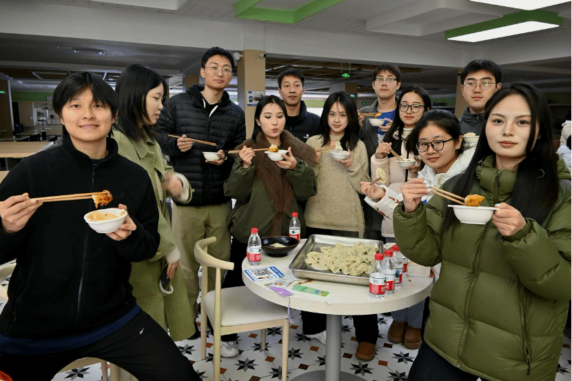 随后,由学校食堂统一煮制饺子,在煮饺子间隙,活动还设置了“冬至知多少”趣味问答环节,围绕冬至节气的历史渊源、诗词文化、地方习俗等内容展开提问。同学们踊跃举手抢答,现场氛围热烈,答对的同学获得了精心准备的文创纪念品,在欢乐互动中进一步加深了对传统节气文化的了解。热气腾腾的饺子出锅后,同学们围坐在一起共享美食,交流包饺子的心得与节日感受。此外,工作人员还将部分饺子打包,送到宿管阿姨、校园保安等工作人员手中,将这份冬日温暖传递给校园里的劳动者。