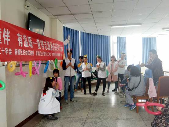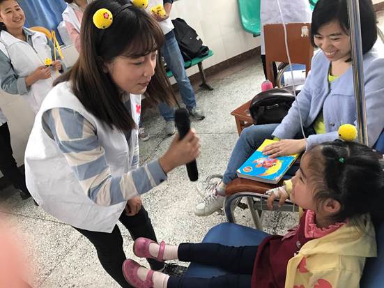 然后,志愿者们为小朋友表演了舞蹈《小鸡小鸡》,并带动部分输液完毕的小朋友一起参与其中,今天的活动也在欢快的舞蹈中落下帷幕。