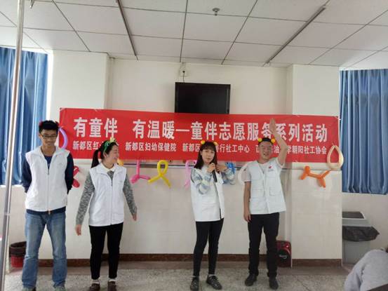 2017年4月27日15时,朝阳社工协会的志愿者们在新都区心悦善行社会工作服务中心的组织下来到了新都区妇幼保健院,开展了童伴志愿服务系列活动之“快乐的小鸡”剧场表演。