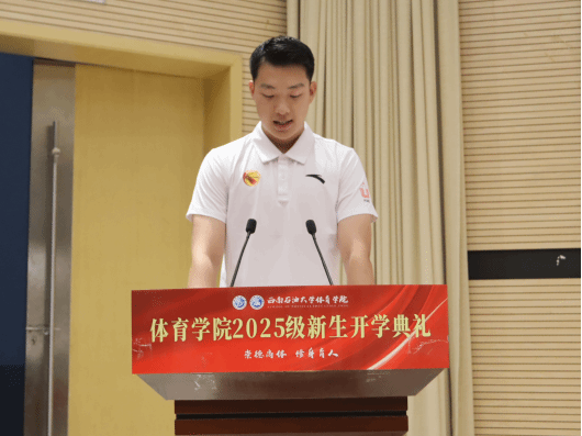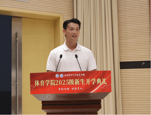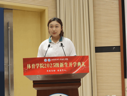 体育教育2025级新生何雨涵作为新生代表发言。她表示,学院的发展底蕴赋予学子坚实的专业自信。在未来大学生活中,将始终铭记学院教诲,明确目标、树立理想;立身修德、不忘初心;勤奋学习、勇于尝试,以实际行动践行体育人的追求。