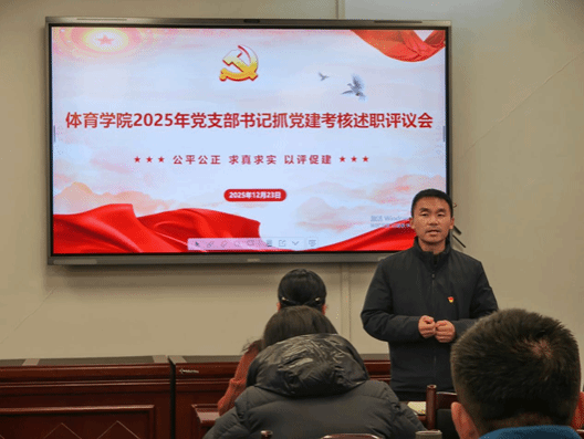 体育学院党委于12月23日下午在体育馆113会议室召开2025年度党支部书记抓党建考核述职评议会。会议由体育学院党委书记向剑锋主持,学校党建办公室主任、党委组织部副部长张凤莅临指导,体育学院全体党委委员、各党支部书记及支部委员参加了会议。