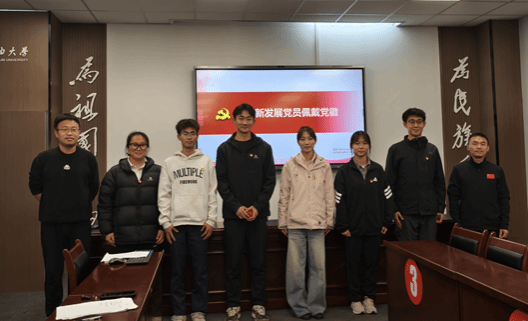 学院党委书记向剑锋、副书记温登峰为新发展的预备党员佩戴党徽,温登峰带领全体党员重温入党誓词,铮铮誓言彰显初心使命。