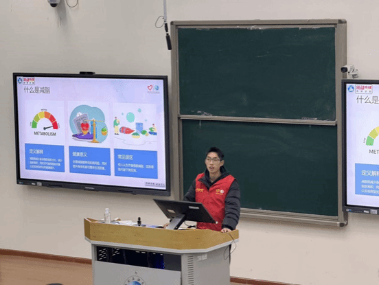 志愿者身着运动先锋马甲,围绕“减脂的科学定义”“健康意义”“常见认知误区”等内容展开讲解,结合代谢原理图示与饮食运动建议,拆解“节食减脂易反弹”等错误观念,引导同学们理性看待体脂管理。