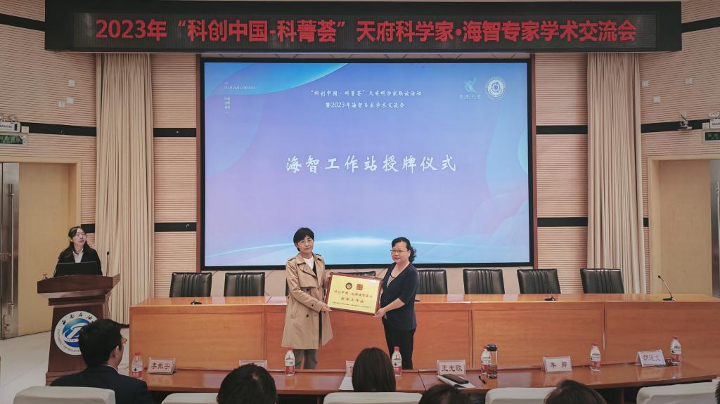 王光欧代表成都市新都区科学技术协会为我校授牌,并对海智人才政策进行解读。