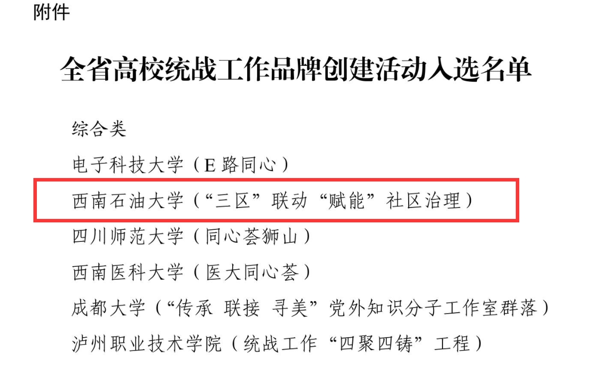 近日,中共四川省委教育工委下发《关于公布全省高校统战工作品牌创建活动入选名单的通知》(川教工委函〔2023〕118号),遴选出15个高校统战工作品牌。我校党委统战部申报的“‘三区’联动‘赋能’社区治理”统战品牌成功入选。