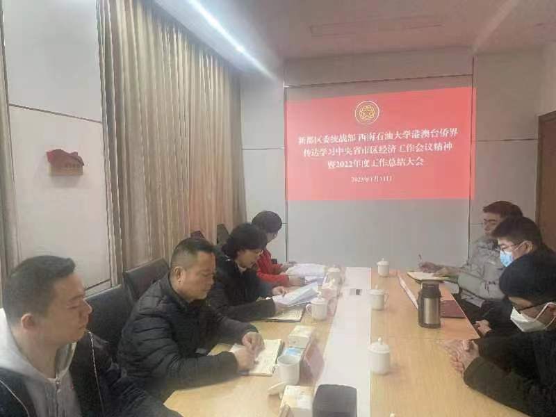 1月11日,我校侨联与新都区侨联在新都区统一战线工作事务中心召开会议,学习传达了中央、省、市、区经济工作会议精神,并对2023年工作开展研讨。新都区委统战部副部长袁志忠、西南石油大学党委统战部副部长牟卿,新都区侨联和我校侨联相关负责人出席会议。会议由新都区侨联副主席唐茜主持。
