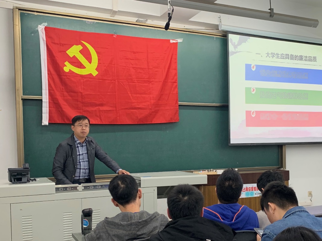 活动第二环节,学院党委副书记、纪委书记于百江旁征博引、深入浅出得对“廉洁”二字进行解读,引用《孙子兵法》对将帅的五德标准,对照《干部任用条例》五项规定,提出了优秀学生的定位标准。于书记以案例的形式犀利地指出了当今大学生学习生活中出现的“考试舞弊、作业抄袭”等不廉洁现象,并告诫同学们“应主动拒绝校园不廉洁行为,自问自省坚守学生干部初心”。