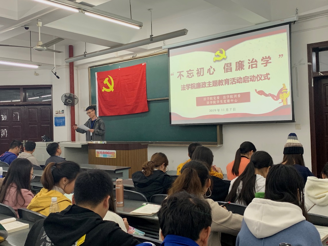 为扎实推进“不忘初心、倡廉治学”主题教育工作,促进学生干部锤炼拒腐倡廉的政治品格,营造风清气正的学院环境,11月7日晚上七点,由法学院党委主办,法学院团委、法学院学生党建中心承办的“不忘初心,倡廉治学”—法学院廉政主题教育系列活动在思学楼A311拉开帷幕,法学院党委副书记、纪委书记于百江出席,学院全体党员、团学干部等150余人参与。