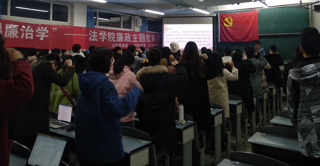 为扎实推进“不忘初心、倡廉治学”主题教育工作,促进学生干部锤炼拒腐倡廉的政治品格,12月19日晚上七点,由法学院党委主办,法学院团委、法学院学生党建中心承办的“不忘初心,倡廉治学”—法学院廉政主题教育系列活动结项仪式在博学楼B307顺利开展,法学院学生党员、团学干部、入党积极分子等人积极参与。