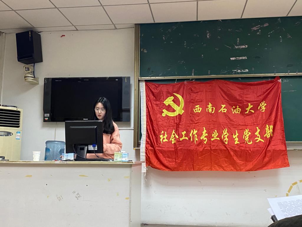 随后支部尹伟明同志代表社会工作专业学生党支部委员会向全体党员做了述职报告,详细讲述了支部在过去一年的工作情况,并深刻剖析了支部工作需要改进的地方。