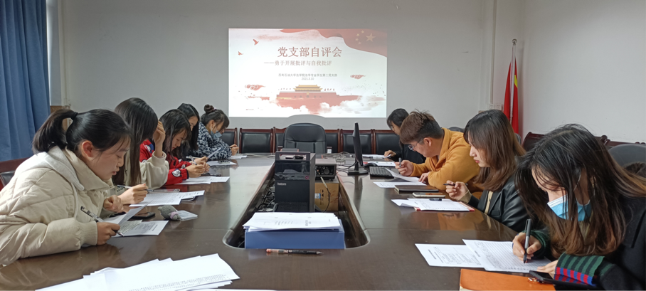 党员自评结束后,由支部委员张珑耀带领全体党员按照主题教育开展情况、严格党员教育管理、联系服务群众以及改进工作作风四个方面进行党支部自评,支部书记总结党员意见后提出了概要为“深入思想理论学习,完善党群结构”的整改措施。