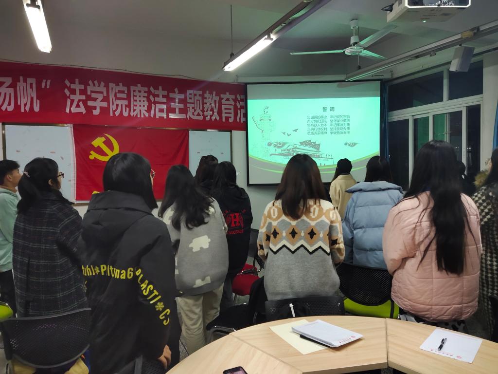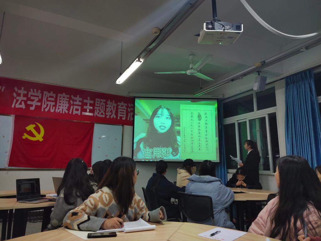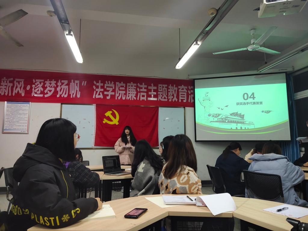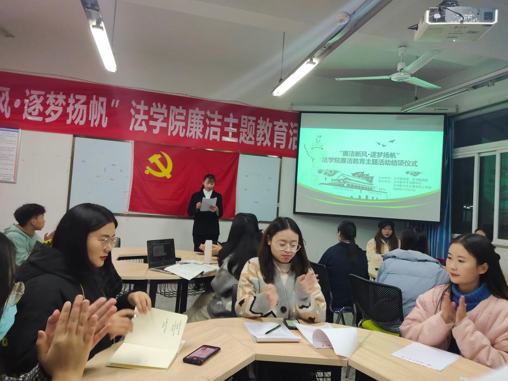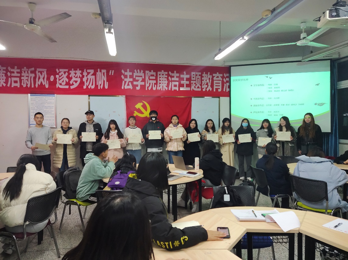 党的十八大会议提出要办好廉洁政治,加强大学生的廉洁教育工作。为积极响应该号召,由西南石油大学法学院党委、法学院团委主办,法学院学生党建中心、法学院学生公寓党员工作站联合承办的“廉洁新风·逐梦扬帆”廉洁教育主题活动结项仪式于2020年11月27日在博学楼A503如期举行。出席本次活动的嘉宾有法学院学生党建中心主任汪佳材及各团委学生代表、党建中心学生代表、入党积极分子代表等。