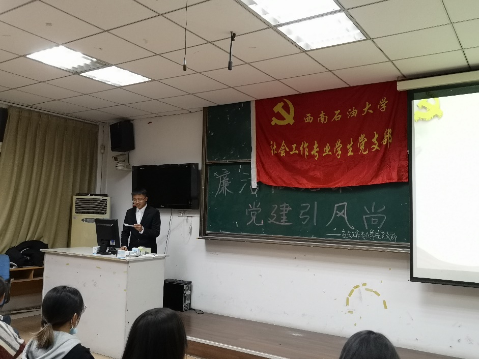 为深入推进党员廉洁教育,学习《中国共产党廉洁自律准则》,强化大学生党员的廉洁意识,法学院社工学生党支部于11月5日在博学楼A406开展了“廉洁微党课,党建引风尚”主题党组织生活。本次党组织生活由第一党小组李桥墩同学主持,党支部全体同志积极参与。