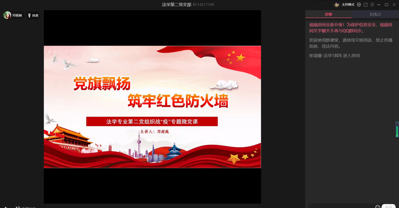 为贯彻落实加强高校基层党建“四个一”行动方案,2020年6月24日,法学院法学专业学生第二党支部举行了以“党旗飘扬,筑牢红色防火墙”为主题的专题微党课。此次党课的目的在于引领带动支部加强基层党建工作,进一步激发青年党员的责任感,在这个没有硝烟的疫情防控战场冲锋陷阵,充分发挥党员先锋模范作用,自觉当先锋、作表率,带头落实防控措施,用行动展现共产党员的精神风范。会议由支部书记邓超越老师主讲,全体党员积极参与。