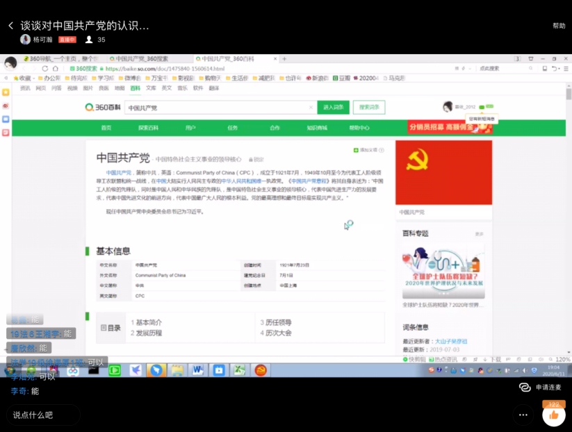 中国共产党是中国工人阶级的先锋队,我们想要加入共产党就必须对党有一定的认识。第一次讨论的主题就是“谈谈对中国共产党的认识”,在杨可瀚老师的引导和讲解下,各小组随后在小组内进行了讨论,组内学员都结合在党课中学习到的知识,针对该主题发表了自己的看法,然后各组内推选代表在班内对讨论结果进行了分享,分享结束后,杨可瀚老师对疫情中党员的先锋模范事例进行了讲解,让同学们通过实际的例子更加深入的理解了中国共产党和作为中国共产党员应该承担的责任。