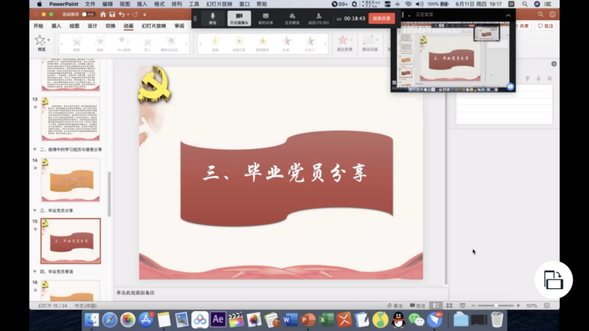 为传达学习两会精神,贯彻新理念,西南石油大学法学院社工党支部于6月11日晚19:00准时召开本学期六月线上党组织生活。临近毕业季,毕业党员即将离开支部,本次会议同时邀请到了优秀毕业党员分享毕业寄语,传递奋斗精神,寄予美好祝愿。