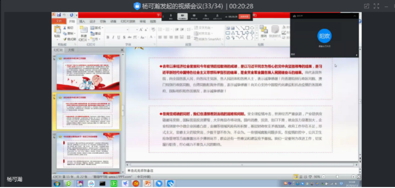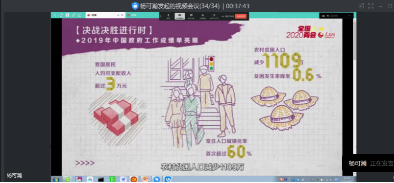 会议伊始,杨老师通过文稿形式向同志们介绍了会议议程,并与同志们一起深入解读了《政府工作报告》八个部分。杨老师指出,这次全国两会是在我国疫情防控阻击战取得重大战略成果,全面建成小康社会决胜之年,“十三五”规划收官之年,脱贫攻坚决战之年召开的一次重要会议,具有极为深远的意义。两会期间,习近平总书记发表的一系列重要讲话,高屋建瓴、立意高远,为我们在疫情防控常态化前提下,做好各项工作指明了前进方向,提供了根本遵循。据此,杨老师强调,学习贯彻全国全省两会精神将是我们当前和今后一个时期的重大政治任务。