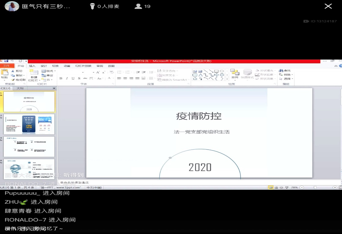 会议伊始,杨老师介绍了目前全球的疫情状况,并指出了抗疫形势的严峻性,在“人类命运共同体”的背景下,需要各国相互协助以共渡难关。本次疫情来势凶猛,但越是艰难时刻越要迎难而上。在本次防控战中,国家充分发挥了制度优势和政策优势,让世界见证了中国力量。战“疫”时刻,党员先行,无数党员主动请缨站上了抗疫第一线。由此,杨老师向同志们强调了党员的先锋模范作用,即使在特殊时期,同志们也应当严格要求自己,做到认真学习、独立思考,并积极为抗疫贡献力量。