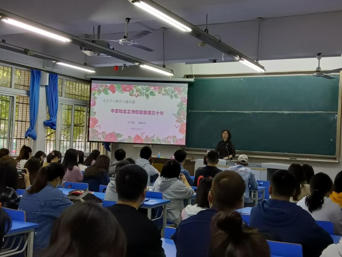 为深入开展党史学习教育,引导青年学生坚定理想信念和信仰信心,2021年10月14日下午法学院党委又一堂生动的党史课在博学楼B101开展。党课的主讲人为法学院副院长谭祖雪同志主讲题目为《中国社会工作恢复重建三十年》。她所联系的社会工作专业本科生、社工研究生党支部的全体党员和入党积极分子参加了本次会议。