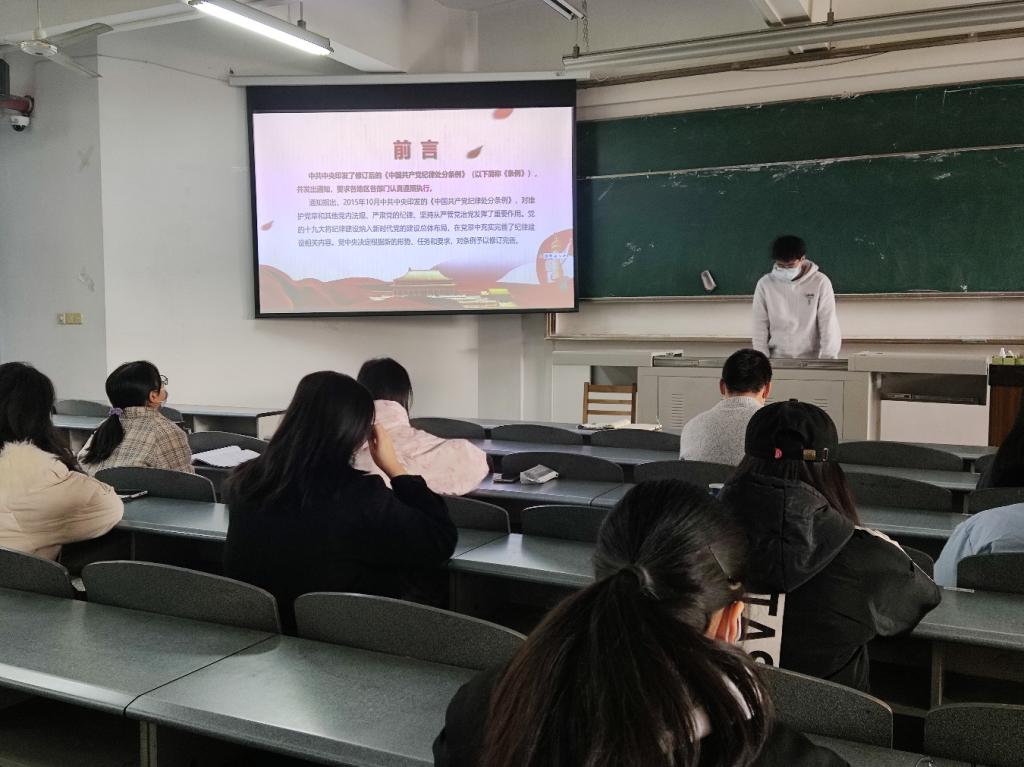 为进一步推进党风廉政建设,增强党员的纪律观念,切实加强纪律作风建设,引导广大党员牢固树立党纪意识,筑牢拒腐防变思想防线,法学院法学专业学生第一党支部于11月11日15时10分在博学楼B502开展《中国共产党纪律处分条例》专题学习党组织生活。本次会议由法学院法学专业学生第一党支部书记杨可瀚老师和党支部同志何龙主持,全体同志积极参与。