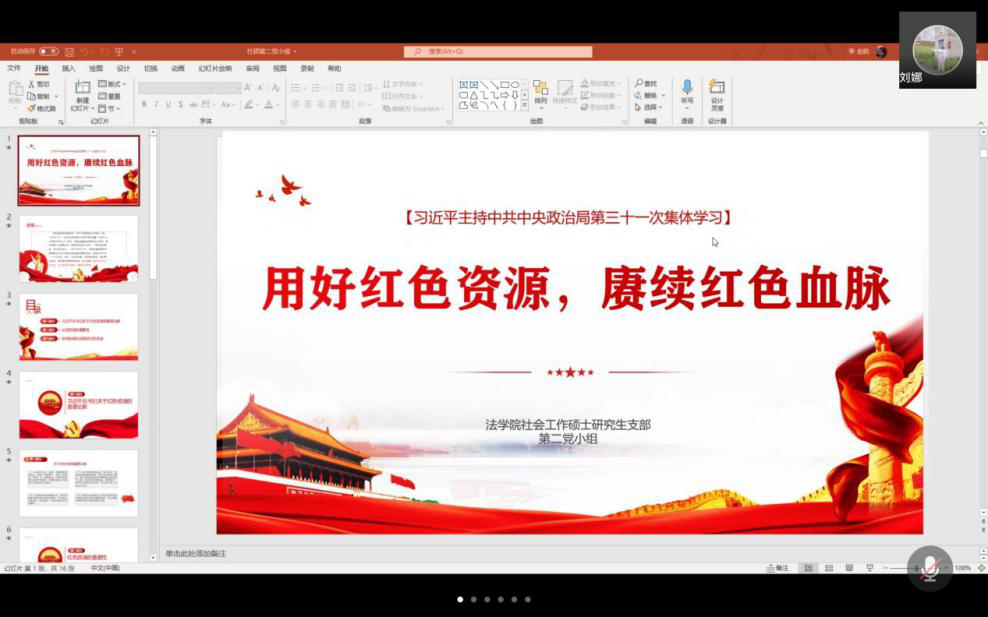社会工作研究生党支部于11月11日下午2:30开展“用好红色资源,赓续红色血脉”主题线上党组织生活会,对习近平总书记在中共中央政治局第三十一次集体学习中的重要讲话进行学习。本次党组织生活会由社会工作专业研究生党支部书记巫艳丽主持,第二党小组李金航同志进行分享。