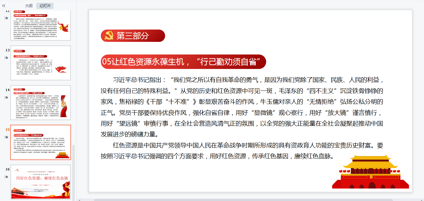 习近平总书记在七一前夕带领中央政治局同志来到北大红楼、丰泽园毛泽东同志故居,并发表重要讲话,基于此背景李金航同志从“习近平总书记关于红色资源的重要论断”、“红色资源的重要性”、“如何管理好和运用好红色资源”这三个部分进行分享讲解。在“如何管理好和运用好红色资源”这部分内容的讲解中,李金航同志还介绍了四川在此方面的做法以及党员同志应该如何做等内容。
