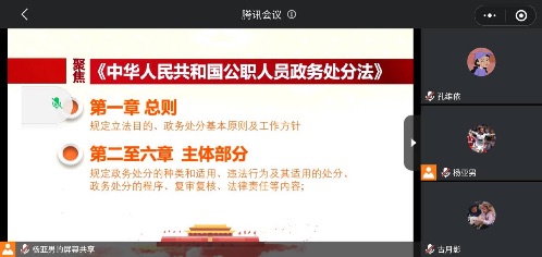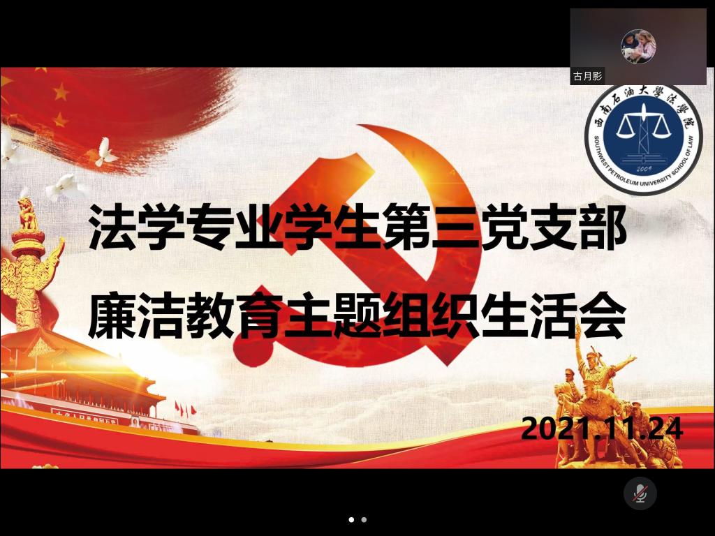 2021年11月24日晚20:00,西南石油大学法学院法学学生第三党支部通过腾讯会议开展了线上会议,会议开展了廉洁教育,并围绕《把权力关进制度的笼子里——中国共产党反腐倡廉理论与实践》一书进行了读书分享。会议应到15人,实到15人,党支部书记平凯同志主持本次会议,会议顺利召开。