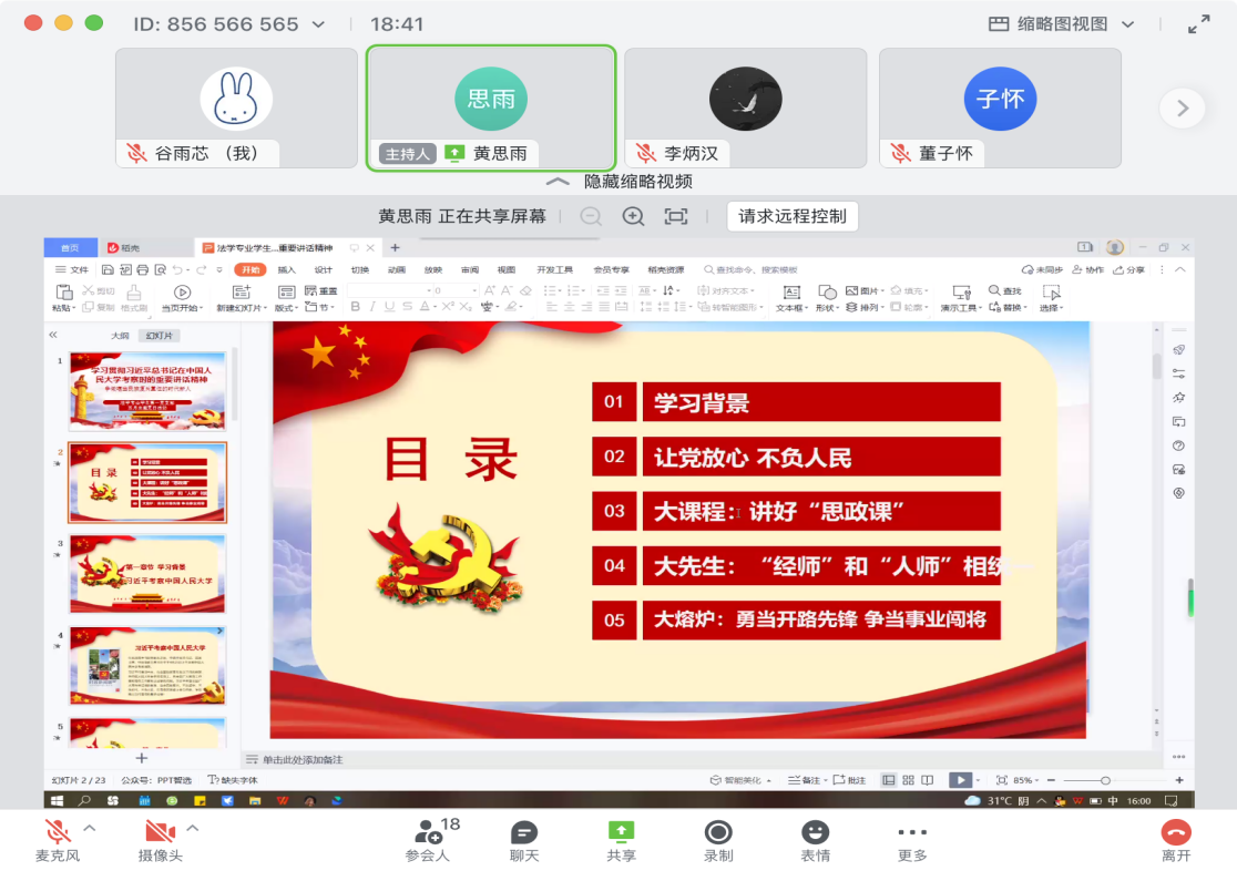 在五四青年节到来之际,中共中央总书记、国家主席、中央军委主席习近平于4月25日上午来到中国人民大学考察调研。为认真传达学习习近平总书记在中国人民大学考察时的重要讲话精神,培育更多堪当民族复兴重任的时代新人,法学院法学专业学生第一党支部于5月5日下午16:00在飞书会议展开“学习贯彻习近平总书记在中国人民大学考察时的重要讲话精神”主题党日活动。本次主题党日活动由法学院法学专业学生第一党支部黄思雨同志主讲,全体同志积极参与。