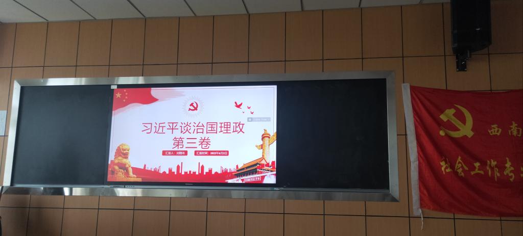 《习近平谈治国理政》第三卷是充分反映党的十九大以来习近平总书记领导全党全国各族人民攻坚克难、砥砺前行伟大实践的最新教材,是用习近平新时代中国特色社会主义思想武装全党、教育人民、推动工作的最新教材,是我们党不忘初心、牢记使命、团结带领人民创造更加幸福美好生活的最新教材,是为世界谋大同、推动构建人类命运共同体的最新教材。社工党支部于2022年6月2日召开主题为学习“《习近平谈治国理政》第三卷”的党组织生活,本次此次党组织生活分四个部分进行,包括政治底色、文化书香、人民情味和四种形态,细致讲解了《习近平谈治国理政》的思想和内容。