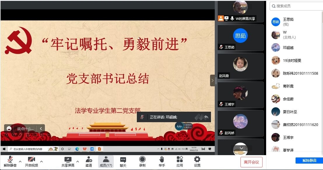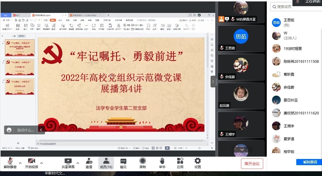 为迎接党的二十大召开,充分学习各高校贯彻落实习近平总书记关于教育重要论述、重要讲话、重要回信精神的做法,7月4日上午10点,西南石油大学法学专业学生第二党支部在腾讯会议上组织收看了“牢记嘱托,勇毅前进”2022年高校党组织示范微党课第四期,支部全体成员参与了此次会议。