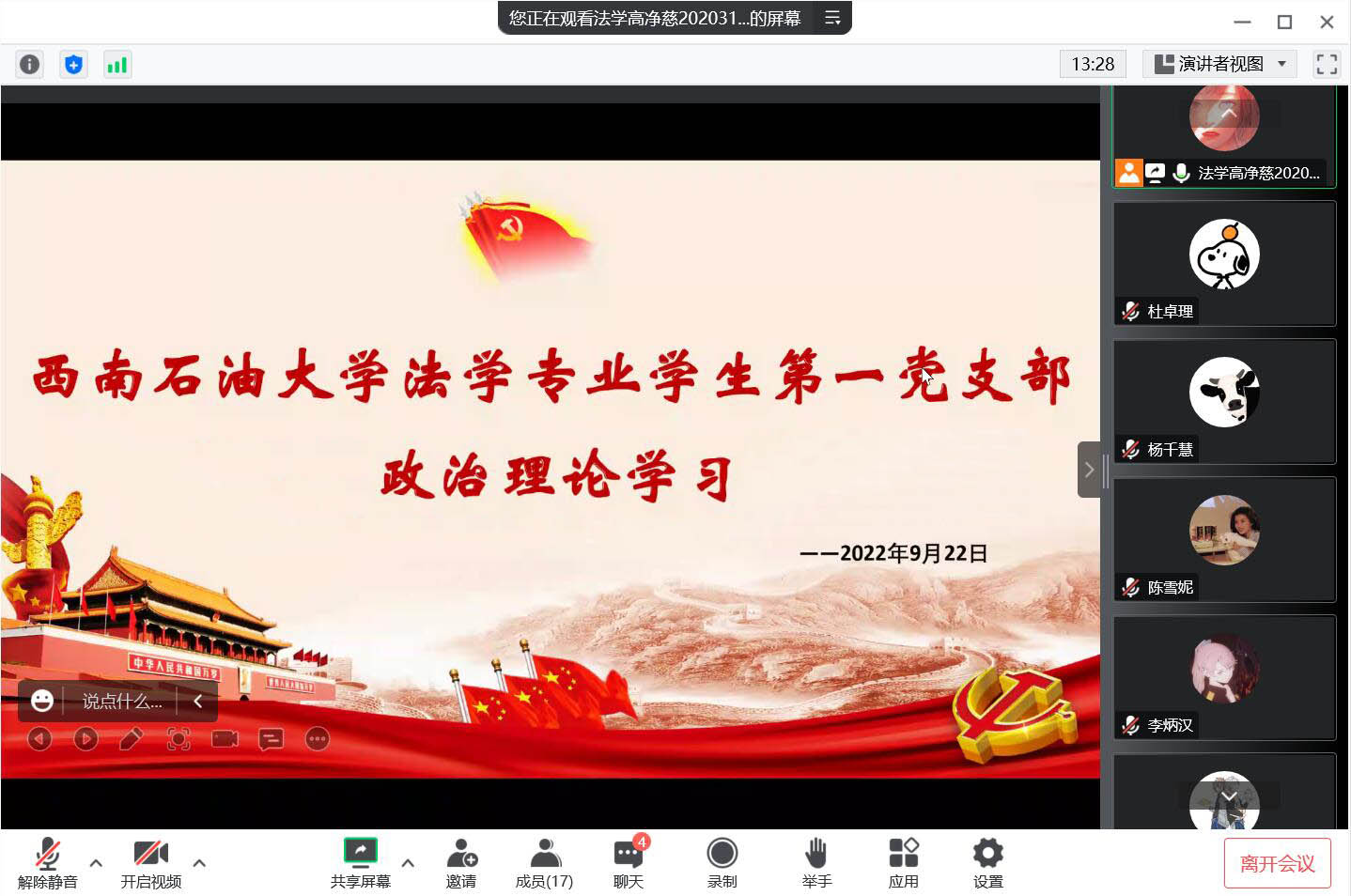 为深入学习贯彻习近平新时代中国特色社会主义思想,贯彻落实党的十九届六中全会精神,加强党员教育与理论学习,推进支部建设,法学专业学生第一党支部于9月22日15时开展线上会议,进行政治理论学习。本次会议由法学专业学生第一党支部书记杨可瀚老师和支部委员高净慈同志主持,支部党员陈雪妮同志主讲,党支部全体同志积极参与。