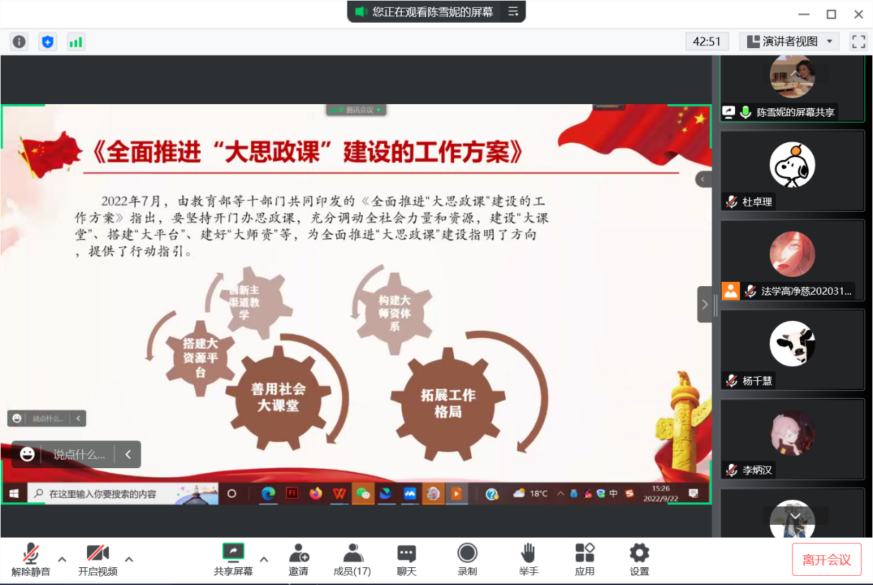 会议最后,支委高净慈同志对本次政治理论学习进行总结。高净慈同志肯定了本次线上会议的顺利开展,同时鼓励支部同志们继续加强理论学习,在学思践悟中不断提升思想理论素养,更好地履行新时代赋予的职责和使命。