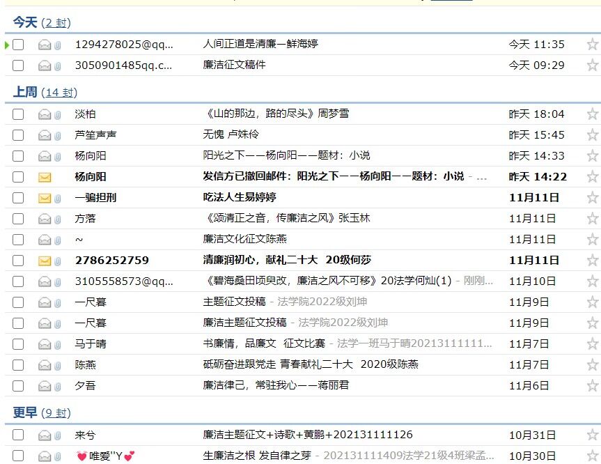 此次活动分为“书廉情,品廉文”主题征文比赛、“传廉音,颂廉德”主题演讲比赛以及“创廉品,学廉记”视频征集赛,经过前期宣传、动员,各类活动参与人数众多,同学们以声音歌颂廉洁、以文字赞美廉洁、以画面记录廉洁。演讲比赛各选手准备充分,内容丰富、感情充沛,以古视今,讲述了从历史到如今那些为人敬佩、令人动容的廉洁故事,他们对廉洁精神的情感表达深深打动了在场评委及观众;本次活动共收到21份征文作品,题材多样,故事新颖,或以小说讲述廉洁故事、或以散文抒发廉洁之志、或以议论文评议何为廉洁、如何廉洁;廉洁之德、之美体现在每一份作品当中。