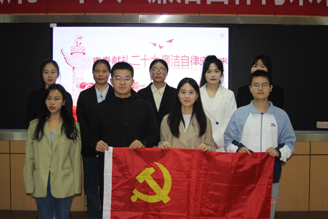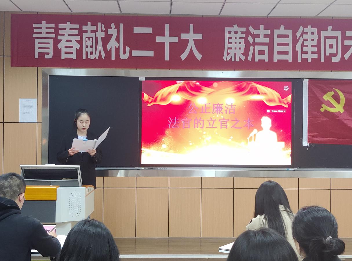 为进一步培养全院同学廉洁自律意识,树立清风正气氛围,提高全院师生品德修养,法学院学生党建工作站于11月11日晚19点30分在博学楼A406举行了“青春献礼二十大·廉洁自律向未来”系列活动之“传廉音,颂廉德”主题演讲比赛。法学院学生党建工作站主任杜舒舒,法学院主持人队前队长高志雨,法学院学生党建工作站综合部部长黄鹏到场担任评委。