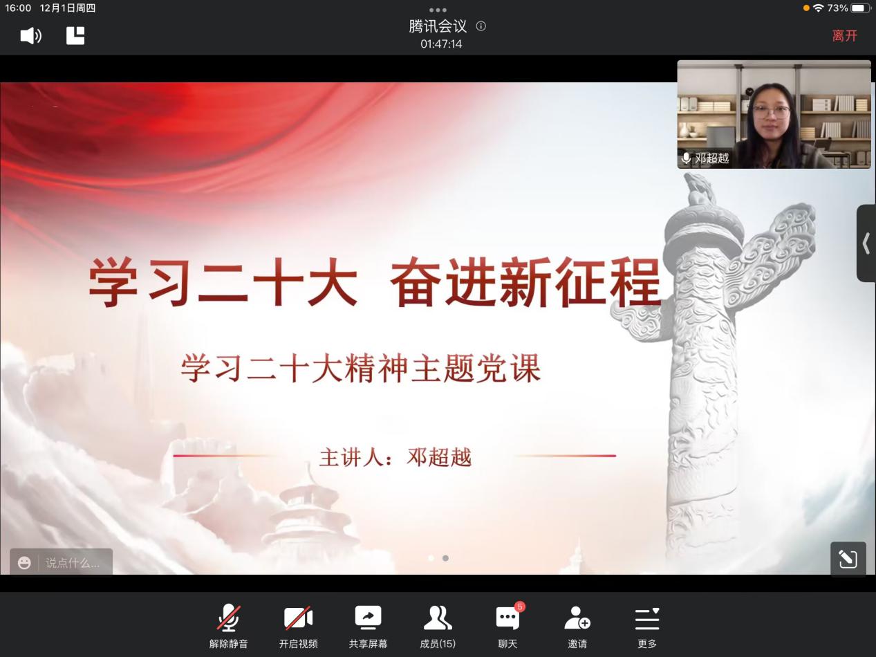 为深入学习贯彻党的二十大精神,领会二十大报告的丰富内涵和精神实质,2022年12月1日下午,法学专业学生第二党支部书记邓超越通过腾讯会议,为支部全体党员讲授“学习二十大,奋进新征程”主题党课。课前,主持人佘佳蔚同志带领全体党员观看了二十大视频资料。