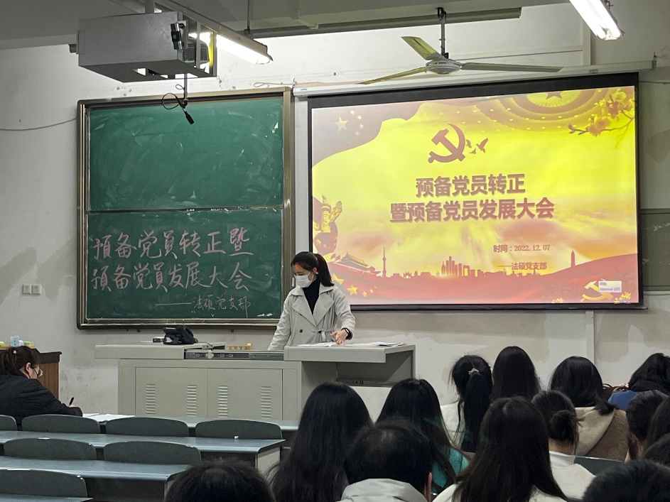 2022年12月7日,法硕党支部在博学楼A306召开预备党员转正暨预备党员发展大会,大会由党支部副书记黄小坚主持。