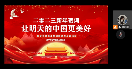 为深刻把握时代发展进程、提高党员同志思想先进性,2月15日晚7:30,在法学院党委的号召下,西南石油大学法学专业学生第三党支部开展了学习习近平总书记2023年新年贺词的主题党日活动。会议由肖彤曦同志主讲,支部全体同志参与。