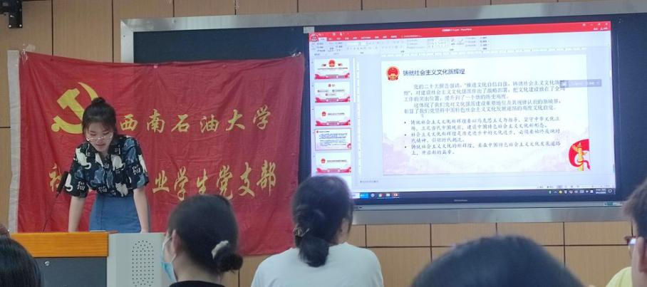 第一部分,主持人刘芸带领支部学生党员和入党积极分子从党的二十大报告着手,一起学习摘编“铸就社会主义文化新辉煌”篇章的内容。“推进文化自信自强,铸就社会主义文化新辉煌”,对建设社会主义文化强国作出了战略部署,把文化建设放在了全局工作的突出位置,提升到了一个新的历史高度。这体现了我们党对文化强国建设重要地位及其规律认识的新境界,彰显了我们党坚持中国特色社会主义文化发展道路的高度文化自觉。