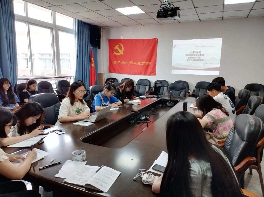 为扎实开展学习贯彻习近平新时代中国特色社会主义思想主题教育,教育引导支部党员踔厉奋发、勇毅前行,法学院法学专业学生第二党支部于2023年6月1日下午1点半在博学楼AB510组织开展春季学期第二次主题教育学习。本次会议由法学专业学生第二党支部书记邓超越同志主持,王成贤同志领学,党支部党员同学线上线下相结合的方式参与学习。