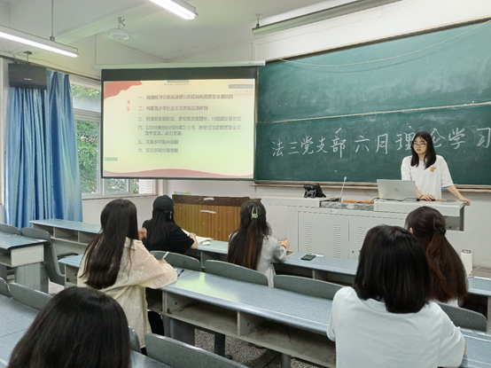 6月21日晚,法学专业学生第三党支部于博学楼A203开展理论学习,本月主题为“不断提高推动高质量发展本领、服务群众本领、防范化解风险本领”。本次主题大会通过线上线下相结合的形式开展,宋米杨同志主持,支部全体同志参加。
