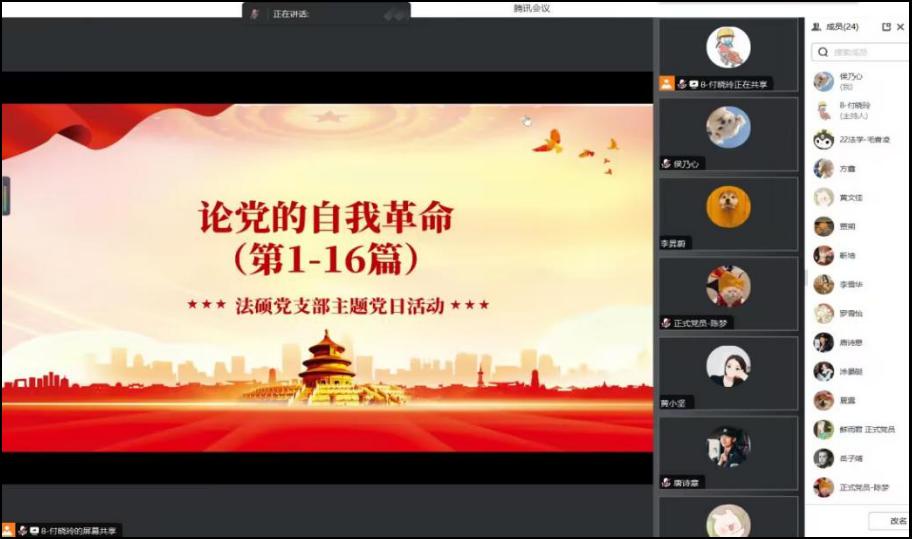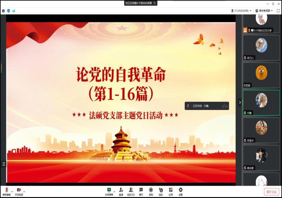 《论党的自我革命》成为党支部首要学习主题。在深入开展学习贯彻习近平新时代中国特色社会主义思想主题教育中,通过读原著,学原文、悟原理,将习近平新时代中国特色社会主义思想转化为坚定思想、锤炼党性和指导实践、推动工作的强大力量。为加深支部成员学习与理解。支部于2023年7月20日以线上会议的形式开展本次主题教育活动,教育重点内容是论党的自我革命,本次主题活动由党支部宣传委员付晓玲主持。