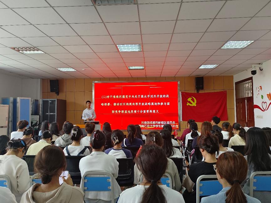 为深入学习贯彻主题教育,推动习近平总书记来川视察重要指示精神落地落实,9月25日,由共青团成都市新都区委员会和法学专业学生第二党支部联合举办的 “学习贯彻习近平总书记来川视察重要指示精神宣讲会暨主题党日活动”在博学楼A402成功举办。法学专业学生第二党支部成员及学生模拟政协协会会员共同参与了本次活动。