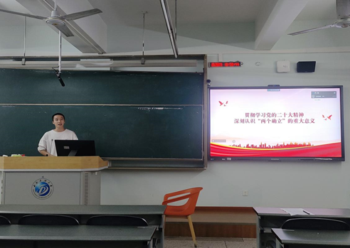 为进一步提升我院入党积极分子的党性修养和理论水平,引导我院入党积极分子将思想统一到党的二十大精神上来,10月26晚7点,我院2023年秋季学期入党积极分子培训班在思学楼A217开展主题为“贯彻学习党的二十大精神,深刻认识‘两个确立’的重大意义”学习教育,2023级社会工作硕士研究生、退役士兵赵然主讲。