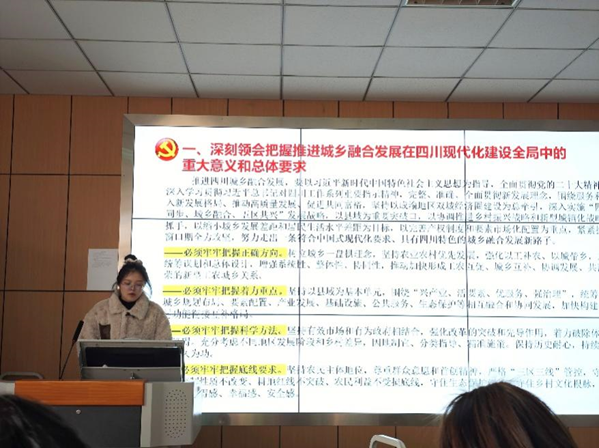 本次理论学习的主要内容为《中共四川省委关于深入贯彻习近平总书记重要指示精神以县域为重要切入点扎实推进城乡融合发展的决定》,蓝英同志主要从重大意义、总体要求这两个方面着手讲解,并选取了相关主要议题进行详细讲解。城乡融合发展是中国式现代化的重要标志,是破除城乡二元结构、拓展高质量发展空间、实现全体人民共同富裕的关键抓手。四川省以县域为重要切入点扎实推进城乡融合发展,具有深刻的历史逻辑、理论逻辑和现实逻辑。